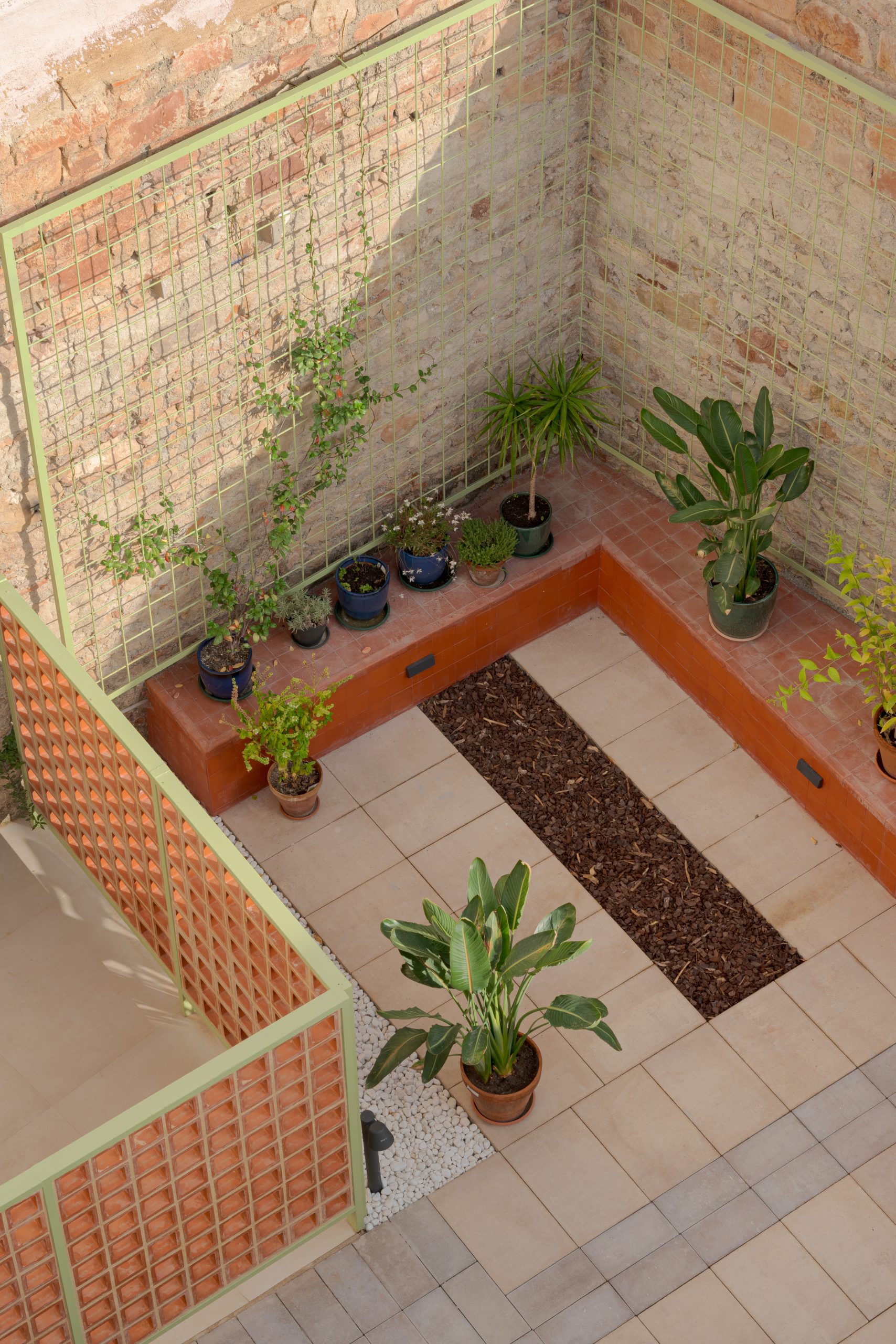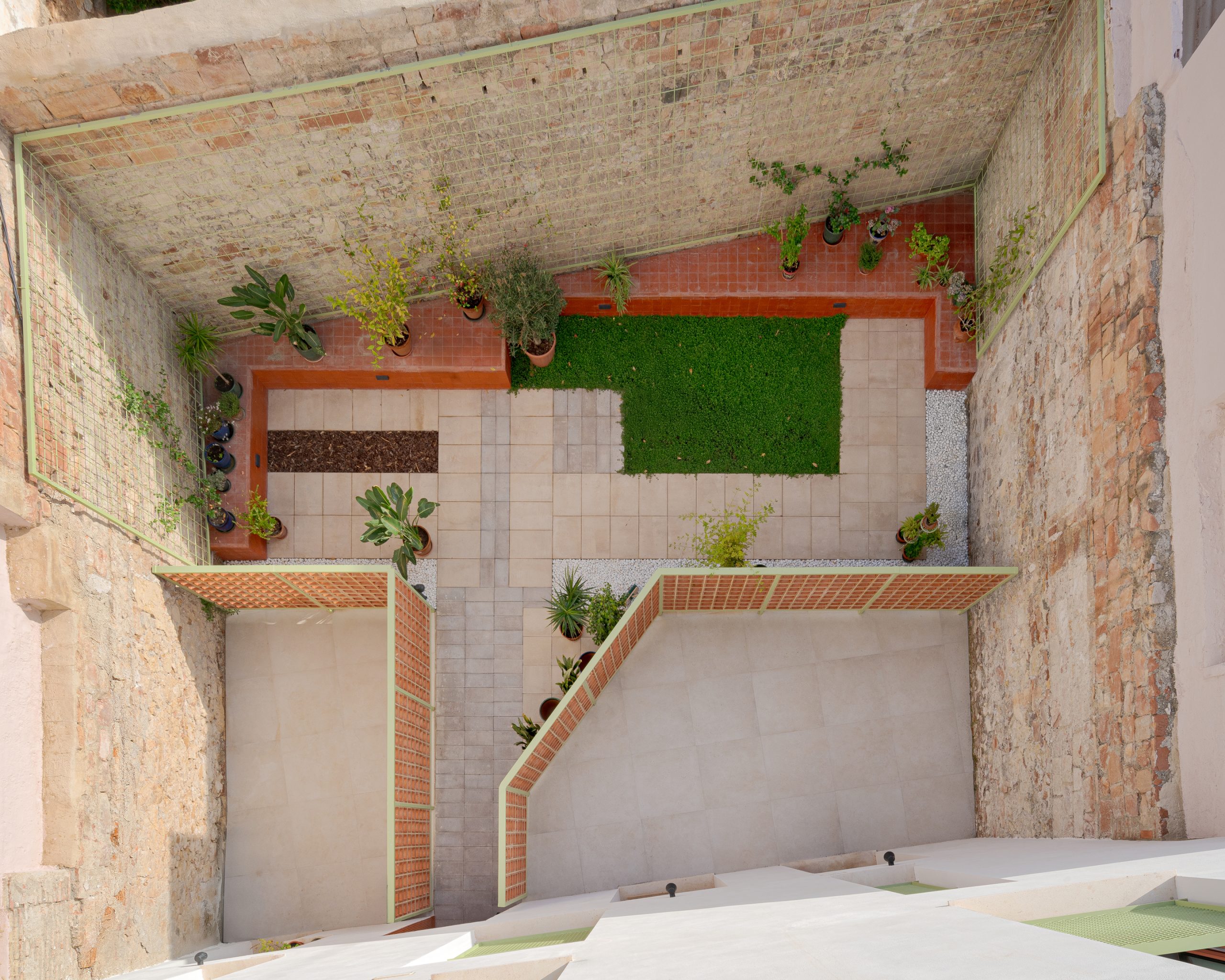 La normativa limitaba la profundidad de la edificación, de modo que el espacio restante se convierte en un jardín interior que conserva vestigios de la construcción original en las medianerías de cantería. El edificio se organiza en cuatro niveles, con 7 viviendas, zonas comunes y una cubierta equipada con solárium y pequeña alberca.