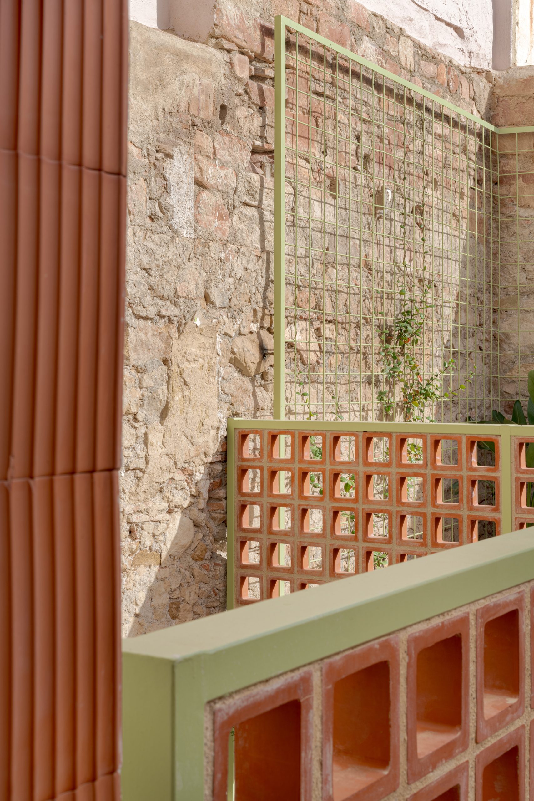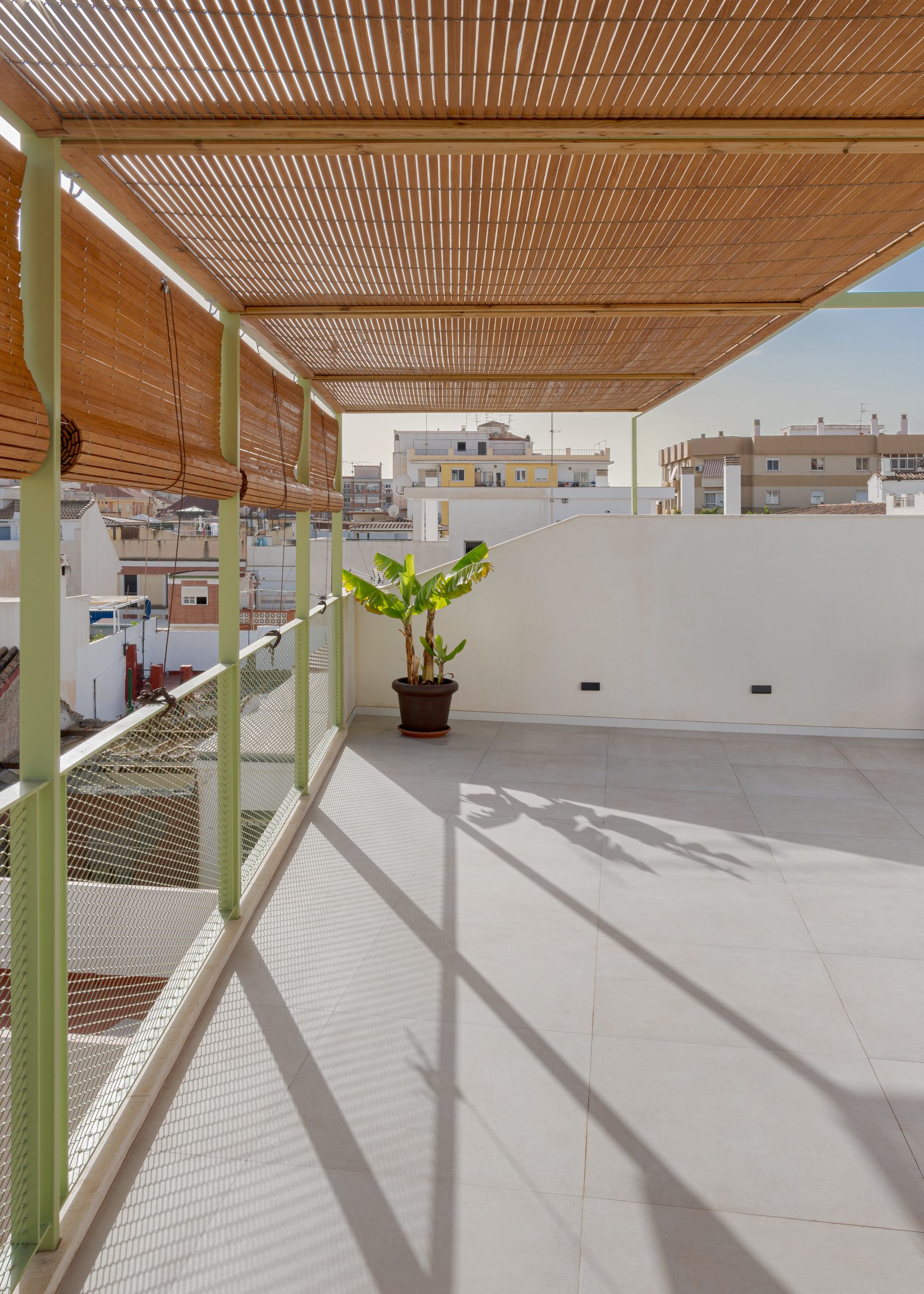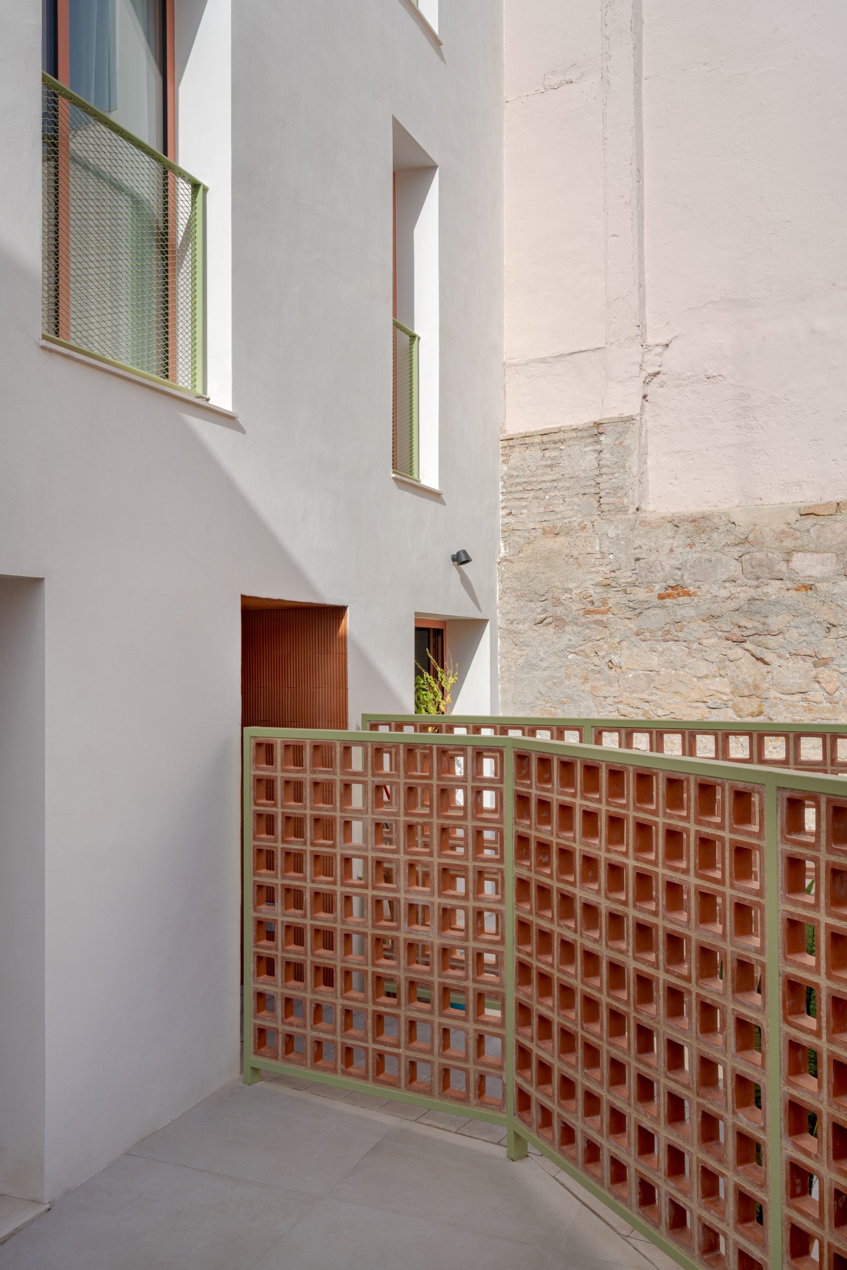 La fachada trasera adopta una composición más libre de llenos y vacíos, evocando las autoconstrucciones del entorno, con carpinterías color cerámico sobre un acabado continuo de mortero de cal romano. Su imagen, mediterránea y luminosa, actúa como telón de fondo del patio-jardín.