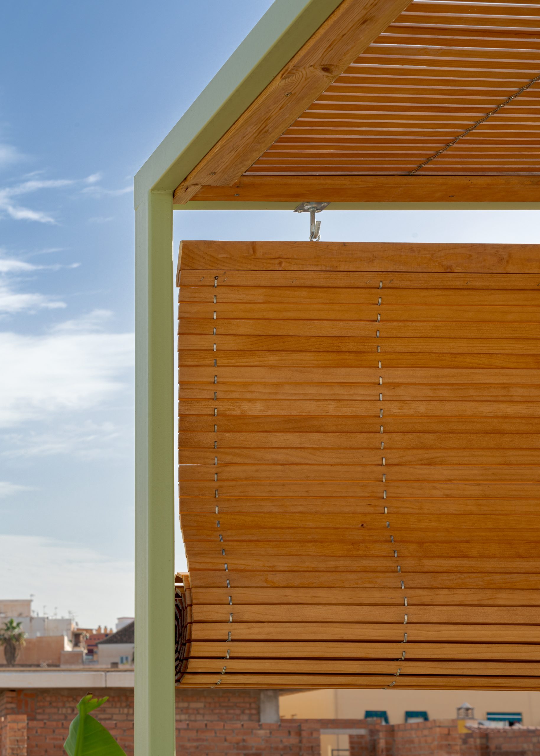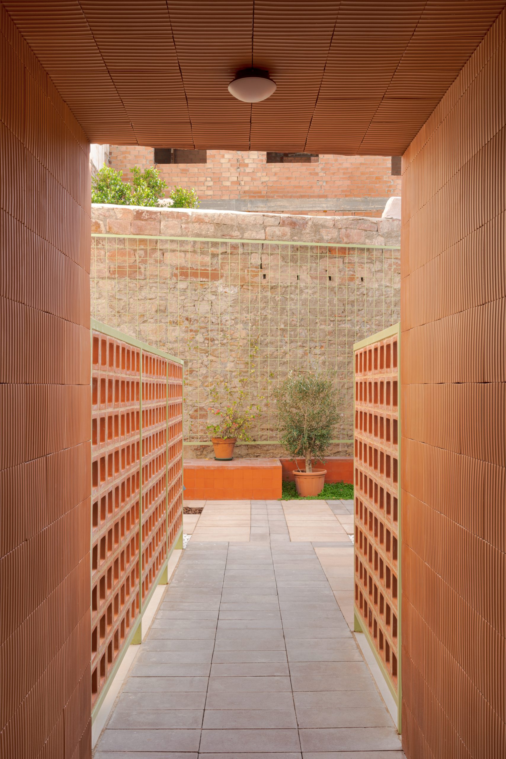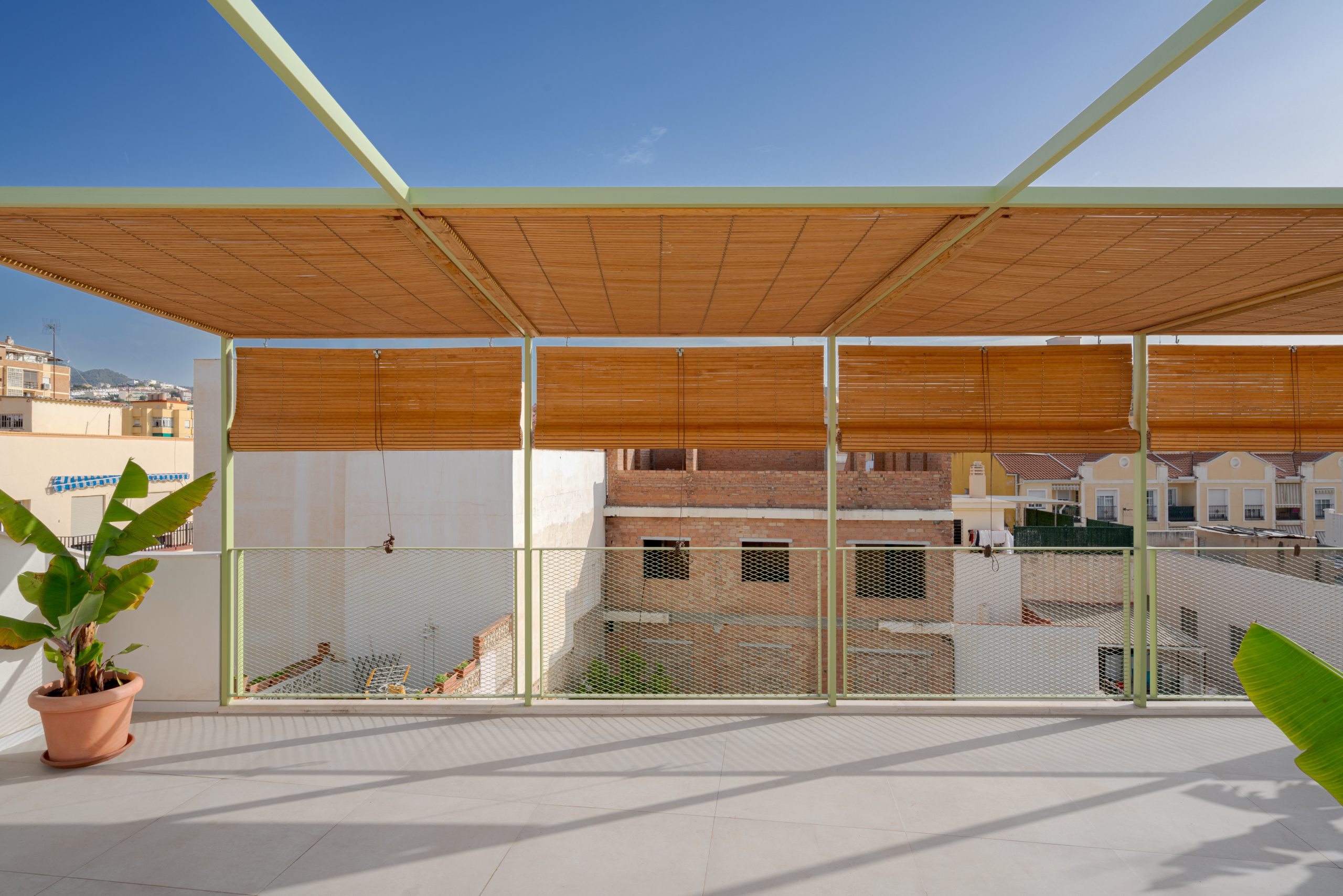 La fachada trasera adopta una composición más libre de llenos y vacíos, evocando las autoconstrucciones del entorno, con carpinterías color cerámico sobre un acabado continuo de mortero de cal romano. Su imagen, mediterránea y luminosa, actúa como telón de fondo del patio-jardín.