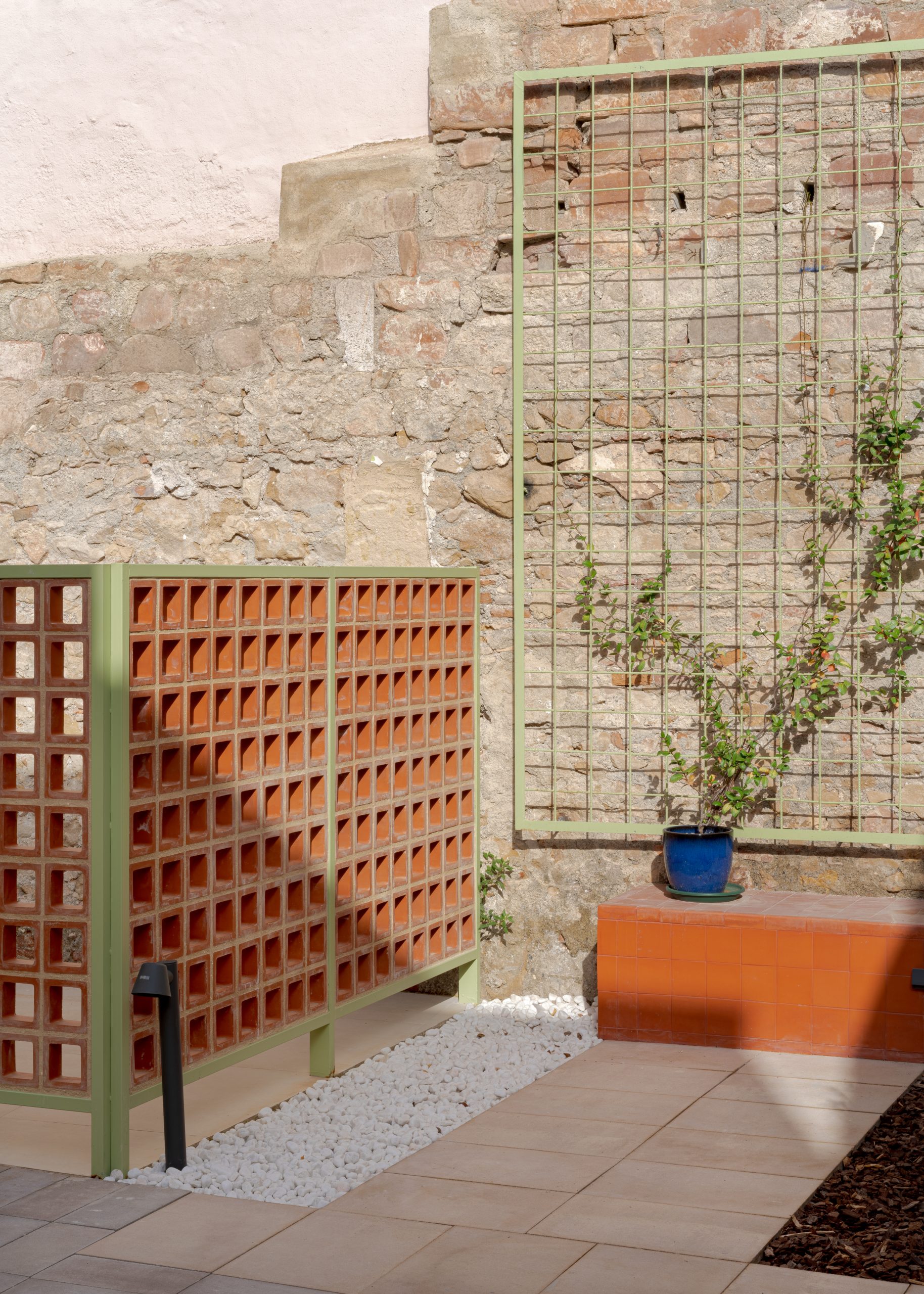En el interior, los alicatados grecados en tonos naturales, ocres y azules se combinan con solería de terrazo tradicional, cerrajería sencilla y carpinterías de roble que aportan calidez y coherencia cromática.